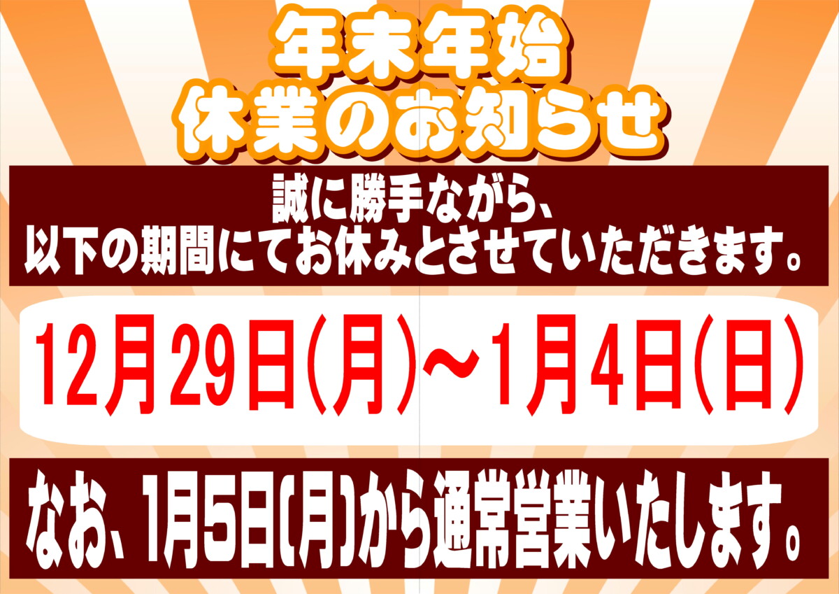 この度、以下の期間にて年末年始休業とさせていただきます。